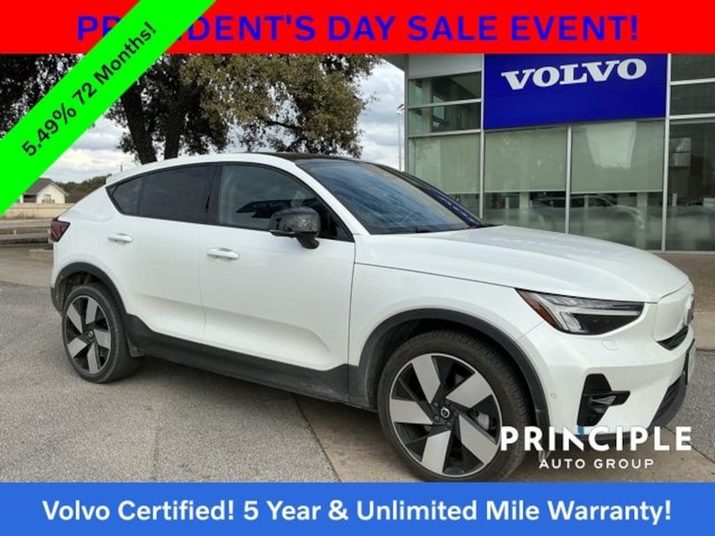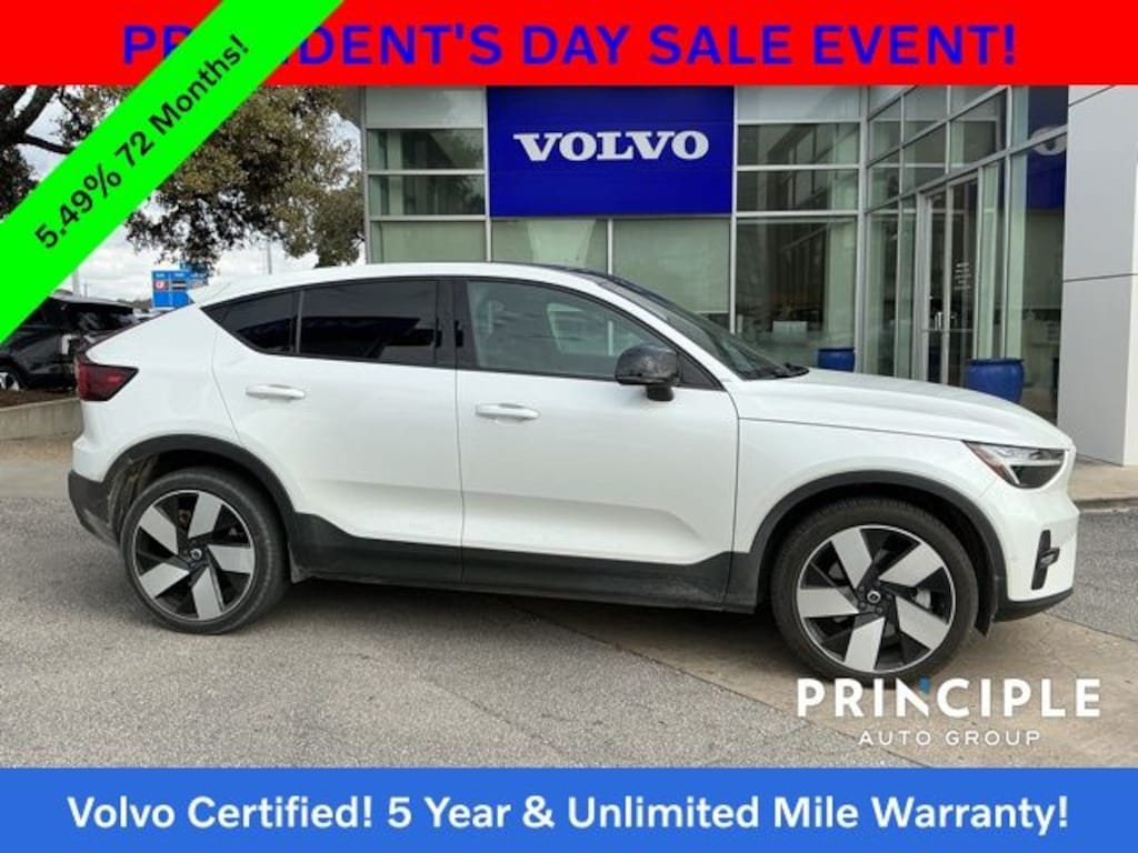 Experience the future of driving with this 2023 Volvo C40 Recharge Pure Electric Twin Plus, now available at Principle Volvo Cars San Antonio. With 72,084 miles, this stylish and fully electric SUV coupe delivers powerful performance, advanced technology, and the premium comfort Volvo is known for. As a Volvo Factory Certified Pre-Owned vehicle, it offers exceptional quality and peace of mind, backed by an incredible 5 year warranty with Unlimited Miles, making it one of the smartest ways to own a luxury electric Volvo in Texas.