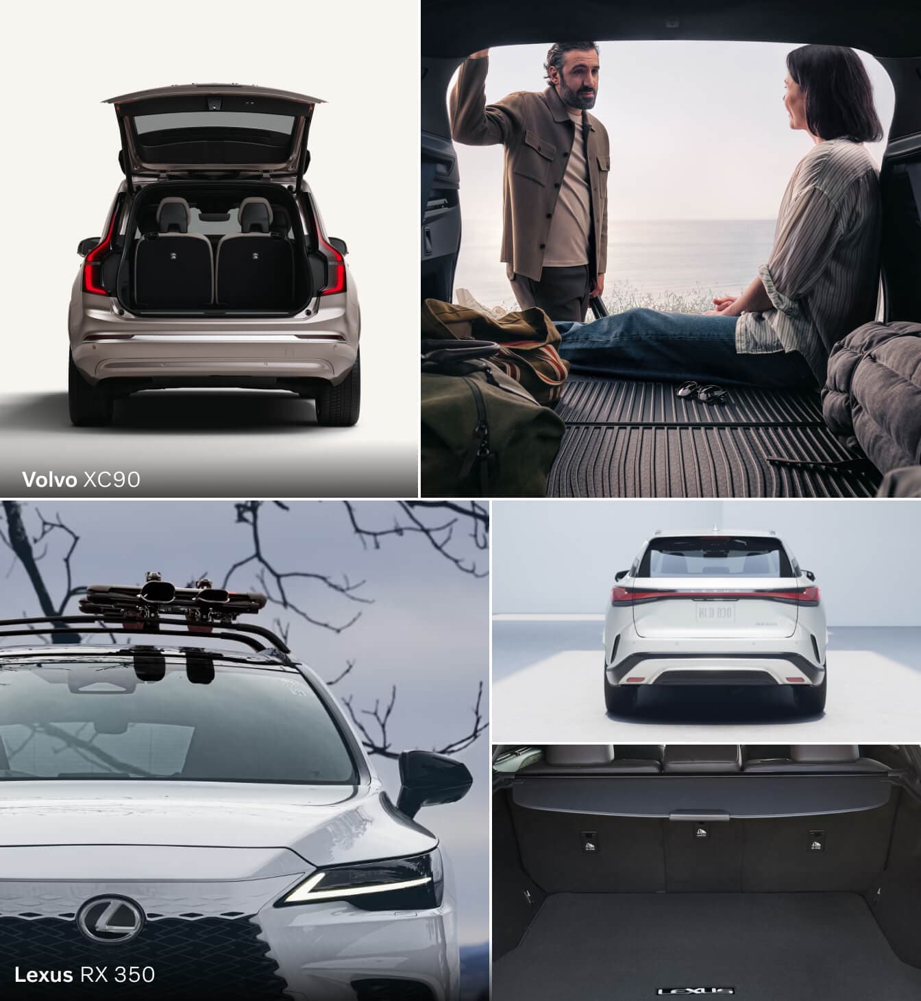 The Volvo XC90 has more total cargo space than the Lexus RX 350. The Lexus model features 29.6 cubic feet behind its second row and 46.2 cubic feet with the seats folded. The Volvo XC90 has less room with all seats up, due to the ever-handy third row, but a more generous 85.7 cubic feet if you fold the second and third rows.
